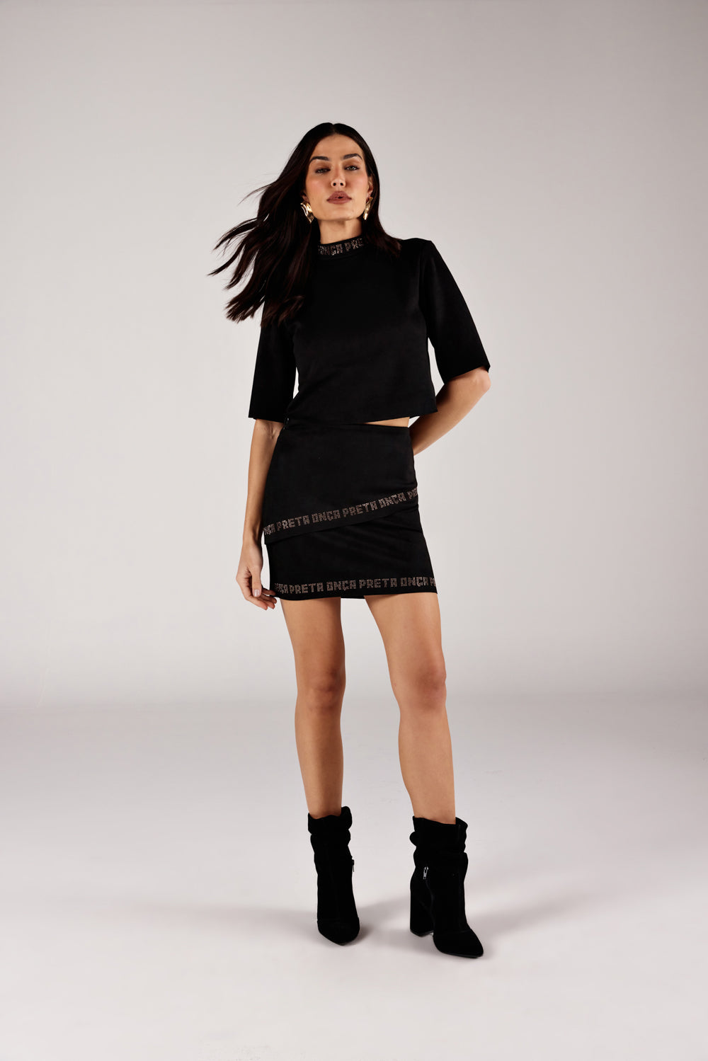 SAIA CURTA FEMININA SOBREPOSTA DETALHE STRASS ONÇA PRETA